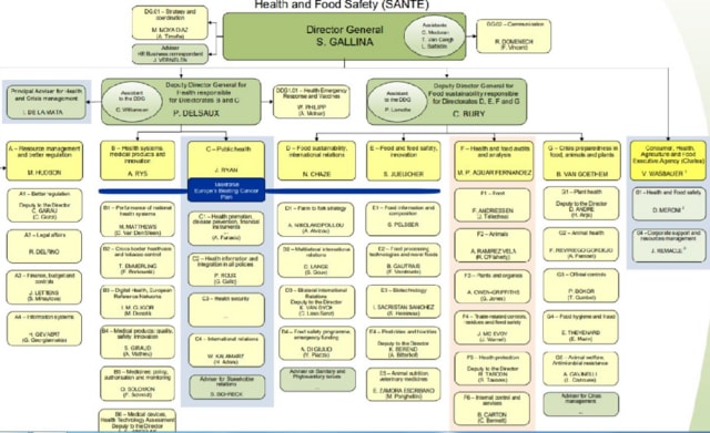 なお、この改組に関するわが国の内閣府食品安全委員会サイトでは、(参考)駐日欧州連合代表部の欧州委員会の部局情報は以下のURLより入手可能である。とあるが、エラーとなる。また、参考までにEUのHealth and Food Safety (SANTE)の組織図を引用しておく。