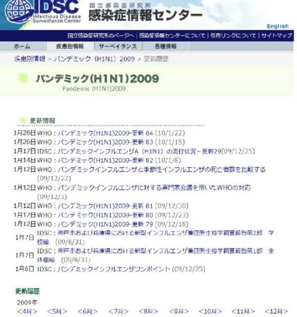 ⑤IDSCの「インフルエンザパンデミック(Pandemic Flu)」の画面右「インフルエンザ関連:新型インフルエンザ(ブタインフルエンザA/H1N1)」をクリック