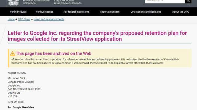 ・カナダ:プライバシー委員によるgoogle street viewに対する原画写真情報の保存期間など再改善意見書(英語)委員のサイトのアーカイブ保存されている。