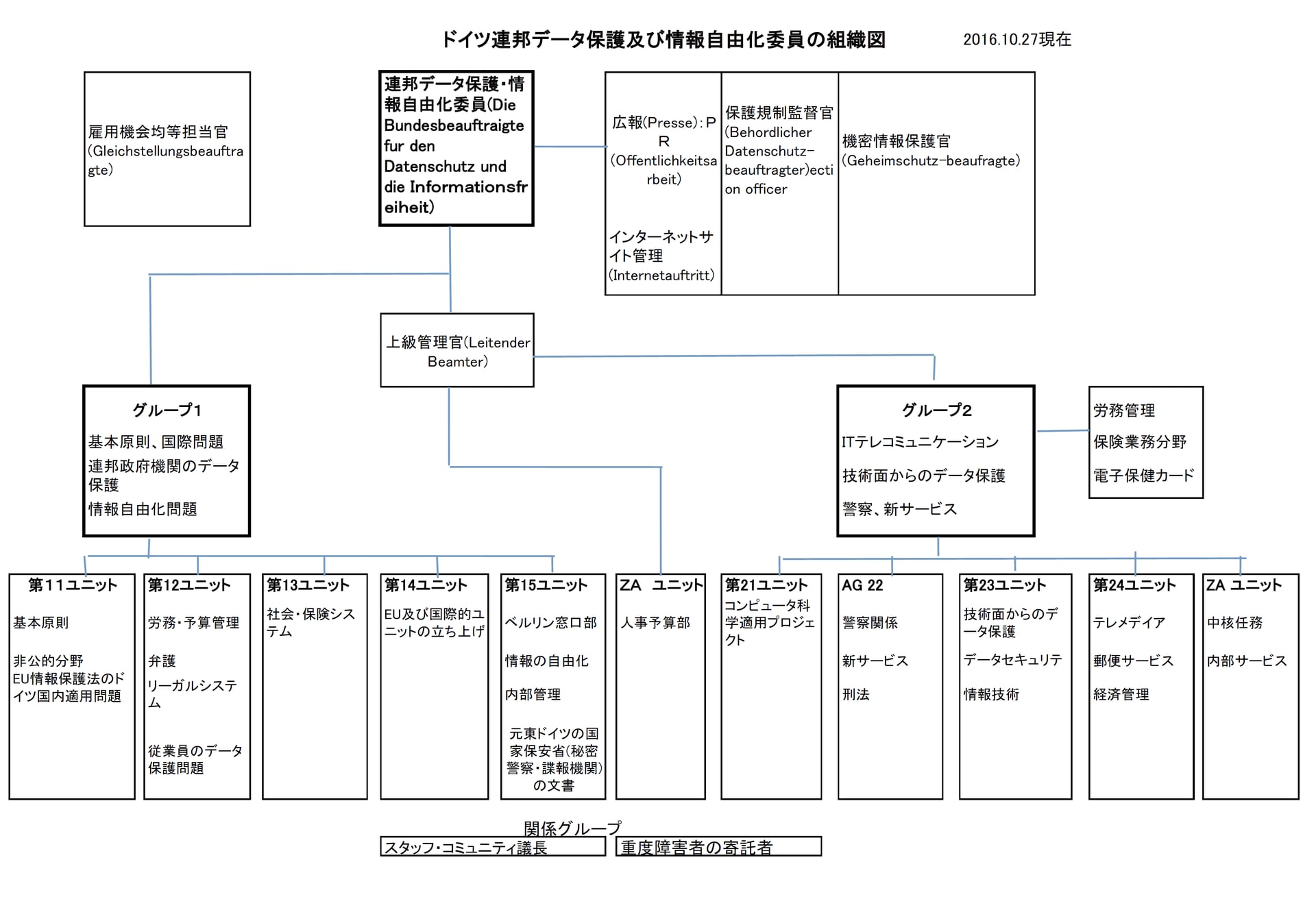 「2014年12月18日にドイツ連邦議会は、2015年3月3日付けの「ドイツ連邦法令公報(Bundesgesetzblatt)」に公布された法律案を可決した。この法律案は、「連邦情報のデータ保護と自由のための監査委員(Bundesbeauftragte für den Datenschutz und die Informationsfreiheit:BfDI)」は、完全に独立性を持ち、独立した最高位の連邦政府の監督機関に移行した。同時に既存の連邦政府による法的監督や連邦内務省監督局(Dienstaufsicht des Bundesministeriums des Innern)の監督は廃止された。この結果、BfDIは、2016年1月1日から「連邦議会」および「裁判所」のみの監督下に置かれる。