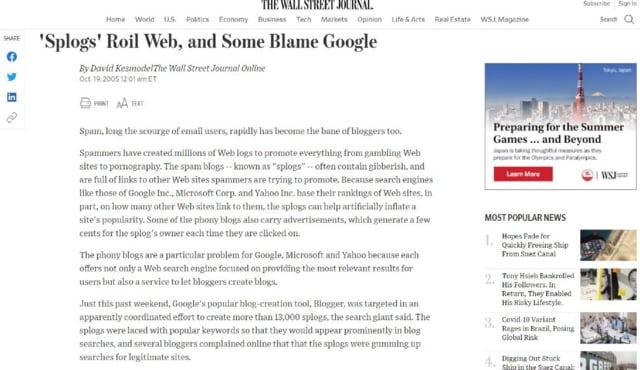 ”Splogs”とは、spam とblogをあわせた言葉である。つまり、このスパマーは「たわごと」のみという例もあるが、多くはギャンブルサイトやポルノサイトの誘導とその利用促進を狙った違法業者の手足として機能するものである。百科事典のWikipediaに最近出てきた用語であるが、2005年10月19日WSJの記事(電子版)をもとにIT詐欺社会の最新情報として紹介する。