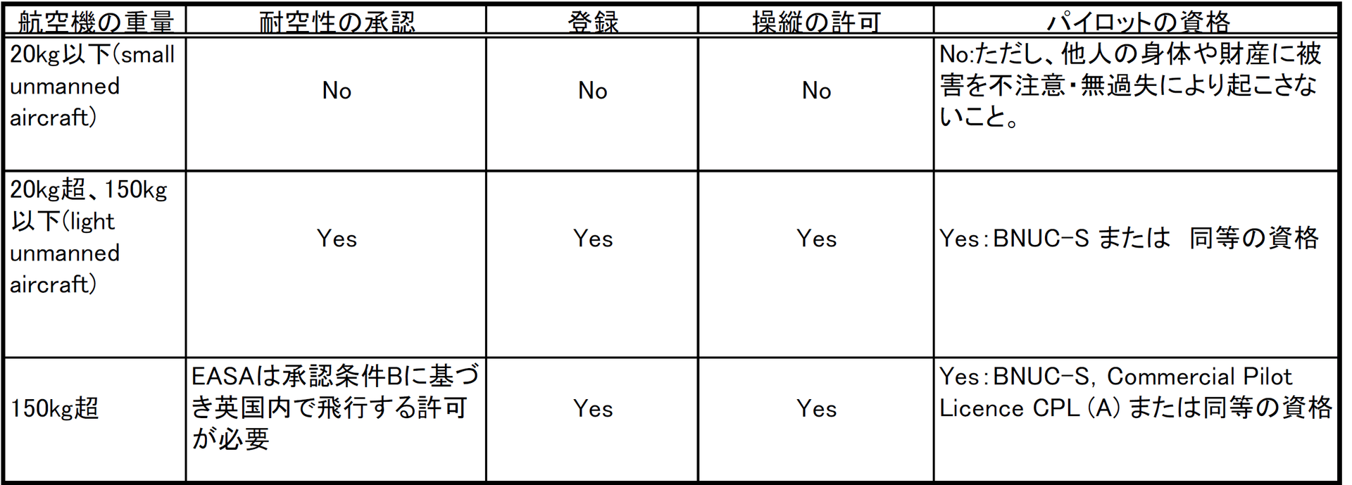 CAAは、これらの重量20kg超150kg以下のUASsをさらに細分規定化する。また150kg超のUASsについては、EU域内の場合は規制機関である「欧州航空安全庁(EASA:European Aviation Safety Agency)」が規制・監督する。