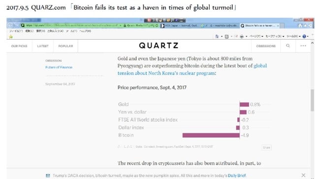 2.北朝鮮の核実験や中国のICO禁止措置等規制強化によるBitcoin等の通貨としての大きなリスクを実証