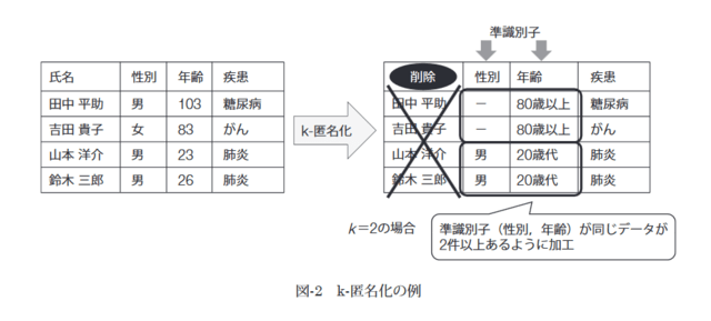 k-匿名化は,組み合わせによって個人特定が可能となる属性を準識別子として定義し,同一の準識別子の組み合わせが必ずk人以上存在するようにデータを加工する手法である。図-2は,k=2,準識別子を性別,年齢と定義した例で,性別,年齢が同じ組み合わせの人が二人以上となり,どのレコードが田中さんであるかを特定できないようにしている。k-匿名化は,組み合わせによって個人特定が可能となる属性を準識別子として定義し,同一の準識別子の組み合わせが必ずk人以上存在するようにデータを加工する手法である。図-2は,k=2,準識別子を性別,年齢と定義した例で,性別,年齢が同じ組み合わせの人が二人以上となり,どのレコードが田中さんであるかを特定できないようにしている。