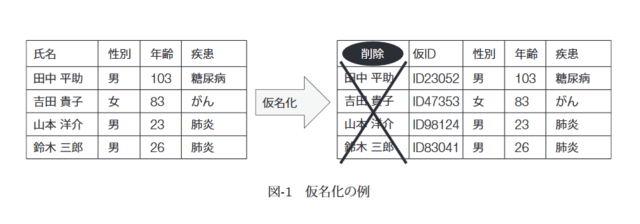 仮名化は,実名を仮名に置き換えることで個人特定を防ぐ手法である(図-1)。この手法は,「田中」という氏名が「ID23052」に置き換わるため,仮名化後も同一人物を追跡できるところが利点であるが,性別,年齢などの属性の組み合わせから,個人が特定されてしまう危険がある。例えば図-1の場合,「男性,103歳」に該当する個人が「田中平助」さんであることを知っている人には,どのレコードが田中さんに対応するか特定できてしまう。