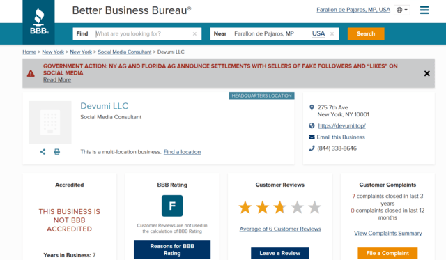 Devrupt LLCとドイツのCalas、Jrが所有する関連会社であるDisruptX Inc.、Sociall Bull Inc.および Bytion Inc.(以上をまとめて「デヴ―ミ」という)は、 ソーシャル・メディア・プラットフォームのユーザーに、偽のフォロワー、「いいね」意見、その他の形式のオンラインでの支持と活動を販売した。デヴ―ミは、1)インターネットにおける自作自演(sock puppet accounts)とは、一つのウェブサイト上で、一人の人間が、同時に複数の人間が活動しているように見せかける行為を行った、2)挑発的メッセージを投稿するTroll、3)脆弱性のある多数のコンピューターを悪意を持って支配するボット(Bots)」等を使用して詐欺行為を行った、これらのボットおよびソックパペット・アカウントは、実際の人々の本物の前向きな意見を表現するふりをしていた。また、4)場合によっては、デヴ―ミは本人のソーシャル・メディアのプロファイルを「同意なし」にコピーした偽のアカウント(名前や写真など)を提供していた。