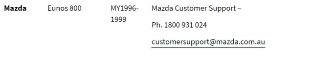 各消費者は、下表で車両の車両識別番号(Vehicle Identification Number)を確認するか、ACCCのオーストラリア安全規制局 (Product Safety Australia website) (筆者注1)にアクセスして、自分の車がこのリコールに含まれているかどうかを確認する必要がある。自分の車が影響を受けているかどうかを確認するために助けを必要とする人は、助けを求めて各メーカーのホットラインを鳴らすべきである。