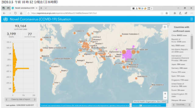 2020.3.510時52分現在のcorona virusのグローバルな拡散情報(WHO)
