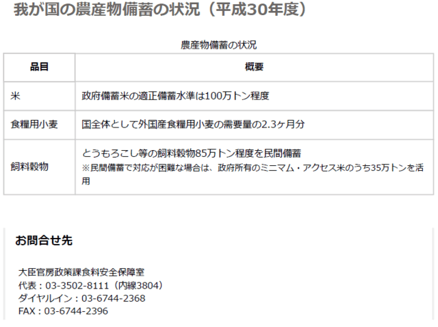 一方、食料の備蓄はどうであろうか。農林水産省の「わが国の農産物備蓄の状況(平成30年度」)は以下のとおりである。この内容も極めて心もとないといえる。