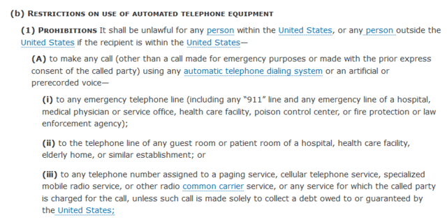 1991年に制定されたTCPAの47 U.S.C. §227(b)(1)(A)(iii) (筆者注2)は、事前の書面による同意がない場合、自動電話ダイヤルシステムまたは人工または録音済みの音声を使用して、電話をかけたりテキスト・メッセージを携帯電話番号に送信したりすることを禁止している。