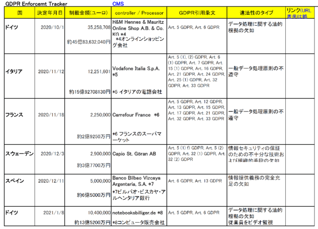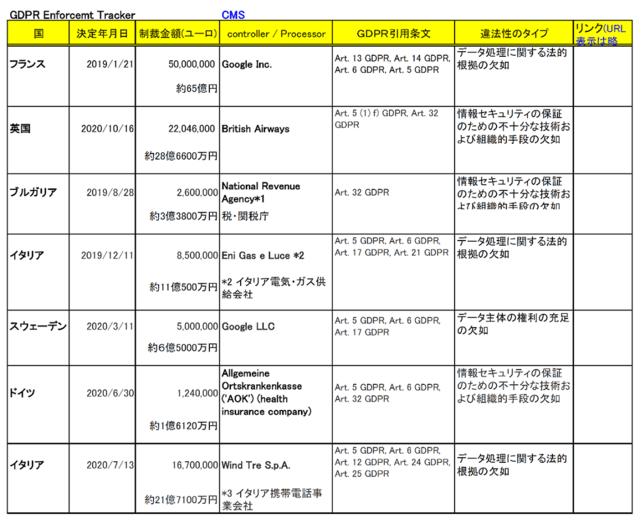 また、さらに気が付いた極めて興味深いサイト” GDPR Enforcement Tracker”である。同サイトはCMS international law firmが作成し、DPAの公式リリースへのリンクが100%保証されている。現在時点で783件がエントリーされている。低額の苦情・制裁事件としては500ユーロ(約65000円)といったものまである。