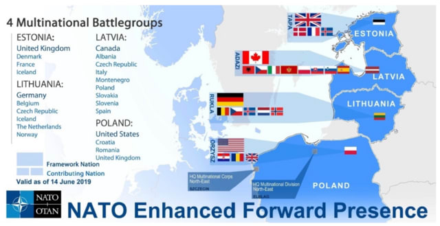 NATOは、エストニア、ラトビア、リトアニア、ポーランドに4つの多国籍大隊規模の戦闘群を交代で配置し、同盟の東部での前向きな存在感を高めている。英国、カナダ、ドイツ、米国がそれぞれ主導するこれらの大隊規模の戦闘群は、大西洋横断の絆の強さを実証し、1つの同盟国への攻撃がアライアンス全体への攻撃と見なす。これは、世代における同盟の集団的防衛の最大の強化の一部である。