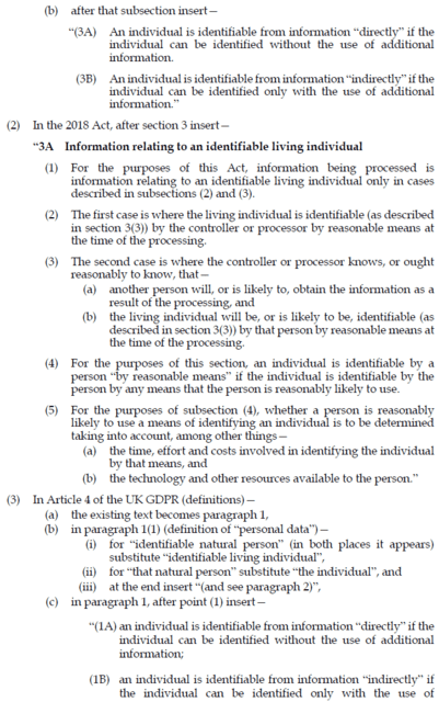 第1条 は、追加の情報が個人を特定するために使用されるかどうかに応じて、「個人データ」の定義を拡張し、かつ緩和する。この規定は、匿名化の基準に関するICOガイダンス(筆者注8)を反映し、識別可能性の問題に対する「主観的な」アプローチを反映している。法案を一部抜粋する。