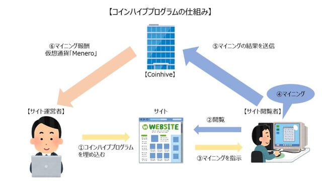 「コインハイブ(Coinhive)プログラム」とは、仮想通貨「Monero」のマイニングを行うためのマイニングツールです。サイトの運営者は自身のサイトに専用のJavaScriptコードを埋め込むことにより、サイトの閲覧者のパソコンを用いて、「Monero」のマイニングを行います。マイニングの報酬はサイトの運営者が獲得するという仕組みになっていました。