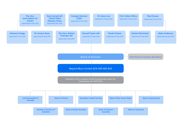 ビヨンド・ブルー・リミテッド(Beyond Blue Limited、以下、「ビヨンド・ブルー」という)は、オーストラリアの公開会社(public company)であり、保証によって制限されている。ビヨンド・ブルーのメンバーは、オーストラリア連邦とオーストラリアの各州および準州である。(組織の詳細参照)