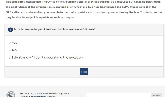 なお、このツールは法的助言ではない。司法長官府はこのツールをリソースとして提供しているが、提出された情報の真実性や企業がCCPAに違反しているかどうかについては何の立場にもない。 司法長官府 は、法律の調査と執行を支援するために、ツールで提供された情報を収集することに注意されたい。また、この情報は、「カリフォルニア州情報公開法(California Public Records Act)」)(注9)の要求の対象となる場合もある。
