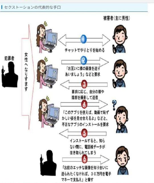 手口としては、SNSや、語学学習・国際交流を目的として外国人と出会える「言語交換アプリ」のメッセージでやりとりをしている際に、性的な動画や写真を送るよう要求されるケースが多く、「もっと動画が交換しやすいアプリがある」などと誘導され、不正アプリをインストールする被害も確認されている。