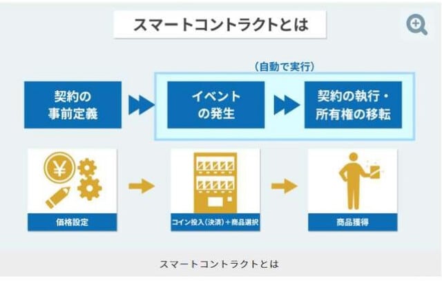 (注9) 「スマート・コントラクト」とは、ブロックチェーン・システム上の概念であり、あらかじめ設定されたルールに従って、ブロックチェーン上のトランザクション(取引)、もしくはブロックチェーン外から取り込まれた情報をトリガーにして実行されるプログラムを指す。ここでの「スマート」とは「賢い」ではなく、「自動的に実行される」という意味で用いられている。(https://www.sbbit.jp/article/fj/40394から抜粋)。