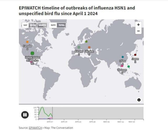 これは、米国で話題になっている乳牛の流行の元となった系統群 (H5N1 系統群 2.3.4.4b) とは異なる。この流行に関連する米国での ミシガン州の酪農家が2 人目のヒト感染例が報告されたばかりで、世界中で、この系統群に関連するヒト感染例は合計 14 件ある。